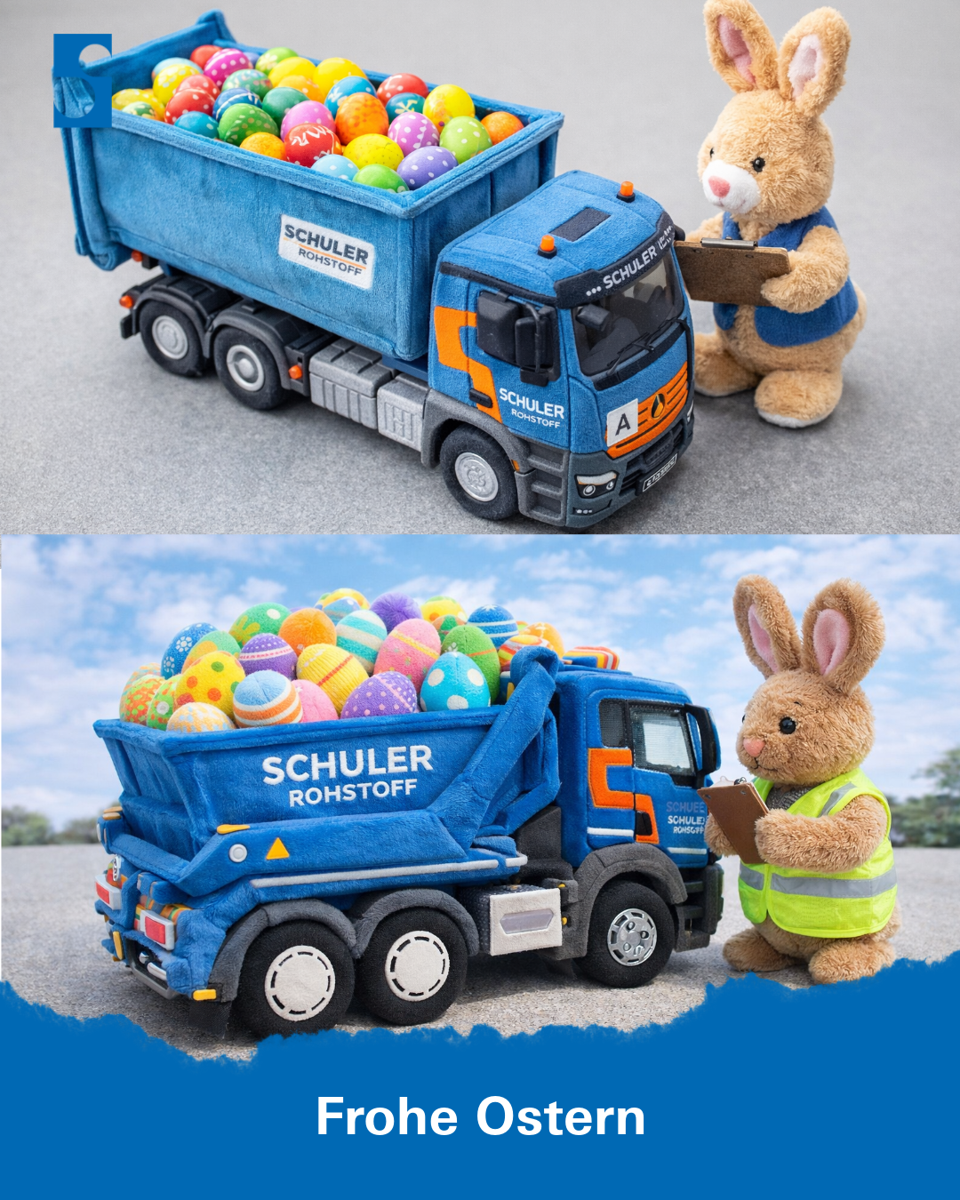 Wir waren nicht auf Eiersuche, stattdessen haben wir unser Material, das wir in unseren LKWs transportieren, vorübergehend angepasst: Wir unterstützen den Osterhasen und verteilen bunte Eier statt Metall und andere Rohstoffe.